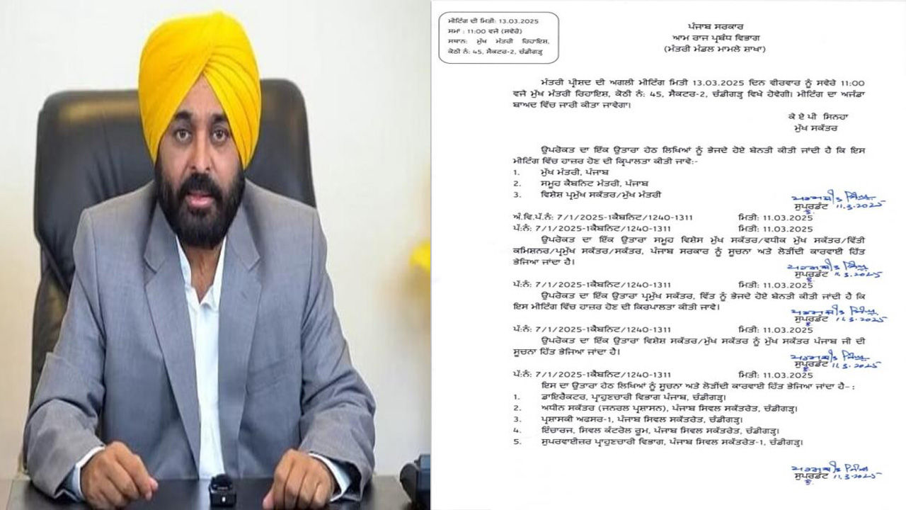 ਪੰਜਾਬ ਦੇ ਮੁੱਖ ਮੰਤਰੀ ਭਗਵੰਤ ਮਾਨ ਨੇ ਪੰਜਾਬ ਕੈਬਨਿਟ ਦੀ ਅਹਿਮ ਮੀਟਿੰਗ ਸੱਦੀ ਹੈ। ਇਹ ਮੀਟਿੰਗ 13 ਮਾਰਚ ਨੂੰ ਸਵੇਰੇ 11:00 ਵਜੇ ਮੁੱਖ ਮੰਤਰੀ ਰਿਹਾਇਸ਼, ਕੋਠੀ ਨੰ: 45, ਸੈਕਟਰ-2 ਚੰਡੀਗੜ੍ਹ ਵਿਖੇ ਹੋਵੇਗੀ।