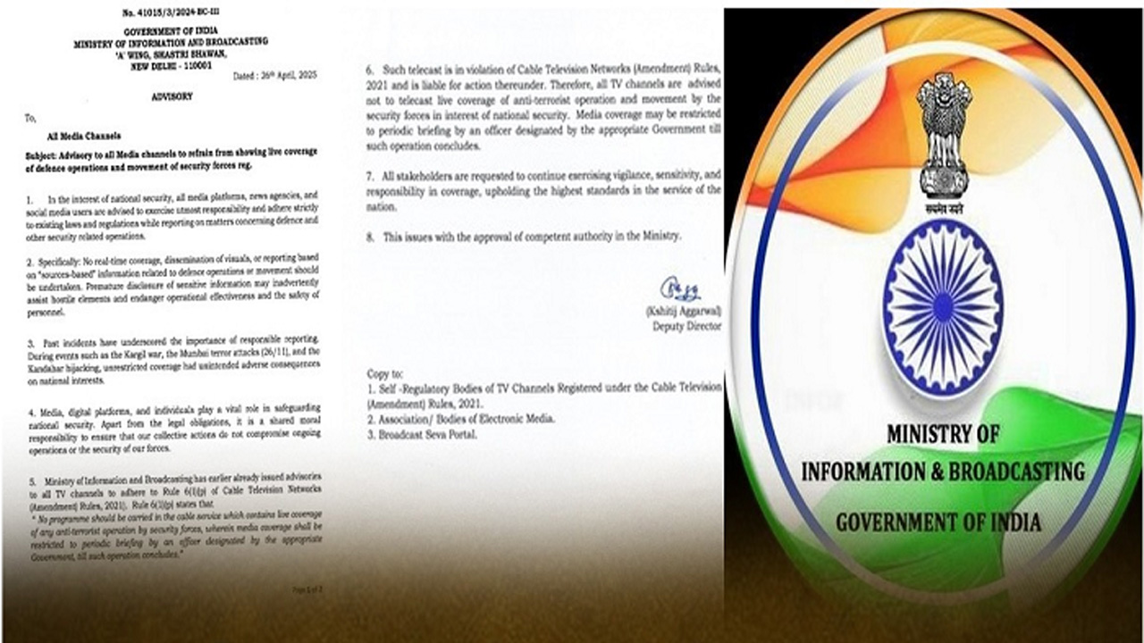 ਸੂਚਨਾ ਤੇ ਪ੍ਰਾਸਰਣ ਮੰਤਰਾਲੇ ਨੇ ਸਾਰੇ ਮੀਡੀਆ ਚੈਨਲਾਂ ਨੂੰ ਰਾਸ਼ਟਰੀ ਸੁਰੱਖਿਆ ਦੇ ਹਿੱਤ ਵਿਚ ਰੱਖਿਆ ਕਾਰਜਾਂ ਤੇ ਸੁਰੱਖਿਆ ਬਲਾਂ ਦਾ ਲਾਈਵ ਕਵਰੇਜ ਨਾ ਦਿਖਾਏ ਜਾਣ ਦੀ ਸਲਾਹ ਜਾਰੀ ਕੀਤੀ ਹੈ। ਸਲਾਹ ਵਿਚ ਰਾਸ਼ਟਰੀ ਸੁਰੱਖਿਆ ਦੇ ਸਰਵਉੱਚ ਮਹੱਤਵ ‘ਤੇ ਜ਼ੋਰ ਦਿੱਤਾ ਗਿਆ ਹੈ ਤੇ ਮੌਜੂਦਾ ਕਾਨੂੰਨਾਂ ਤੇ ਦਿਸ਼ਾ-ਨਿਰਦੇਸ਼ਾਂ ਦਾ ਪਾਲਣ ਕਰਨ ਦੀ ਸਲਾਹ ਦਿੱਤੀ ਗਈ ਹੈ।ਮੰਤਰਾਲੇ ਨੇ ਖਾਸ ਤੌਰ ‘ਤੇ ਕਿਹਾ ਹੈ ਕਿ ਰੱਖਿਆ ਕਾਰਜਾਂ ਨਾਲ ਸਬੰਧਤ ‘ਸਰੋਤ ਆਧਾਰਿਤ’ ਜਾਣਕਾਰੀ ਦਾ ਕੋਈ ਲਾਈਵ ਕਵਰੇਜ, ਦ੍ਰਿਸ਼ ਜਾਂ ਪ੍ਰਸਾਰ ਨਹੀਂ ਹੋਣਾ ਚਾਹੀਦਾ। ਉਨ੍ਹਾਂ ਚੇਤਾਵਨੀ ਦਿੱਤੀ ਕਿ ਅਜਿਹੀ ਰਿਪੋਰਟਿੰਗ ਅਣਜਾਣੇ ਵਿਚ ਦੁਸ਼ਮਣ ਸੰਸਥਾਵਾਂ ਦੀ ਮਦਦ ਕਰ ਸਕਦੀ ਹੈ। ਮੀਡੀਆ ਤੇ ਡਿਜੀਟਲ ਪਲੇਟਫਾਰਮਾਂ ਨੂੰ ਸੰਵੇਦਨਸ਼ੀਲ ਜਾਣਕਾਰੀ ਦੇ ਖੁਲਾਸੇ ਤੋਂ ਬਚਣ ਦੀ ਸਲਾਹ ਦਿੱਤੀ ਗਈ ਹੈ। ਉਨ੍ਹਾਂ ਨੂੰ ਕਿਹਾ ਗਿਆ ਹੈ ਕਿ ਉਹ ਆਪਣੀ ਰਿਪੋਰਟਿੰਗ ਵਿਚ ਸਾਵਧਾਨੀ, ਸੰਵੇਦਨਸ਼ੀਲਤਾ ਤੇ ਜ਼ਿੰਮੇਵਾਰੀ ਬਣਾਏ ਰੱਖਣ। ਕੇਬਲ ਟੈਲੀਵਿਜ਼ਨ ਨੈੱਟਵਰਕ (ਸੋਧ) ਨਿਯਮ, 2021 ਦੇ ਨਿਯਮ 6(1)(p) ਦੀ ਪਾਲਣਾ ਕਰਨਾ ਲਾਜ਼ਮੀ ਕੀਤਾ ਗਿਆ ਹੈ।