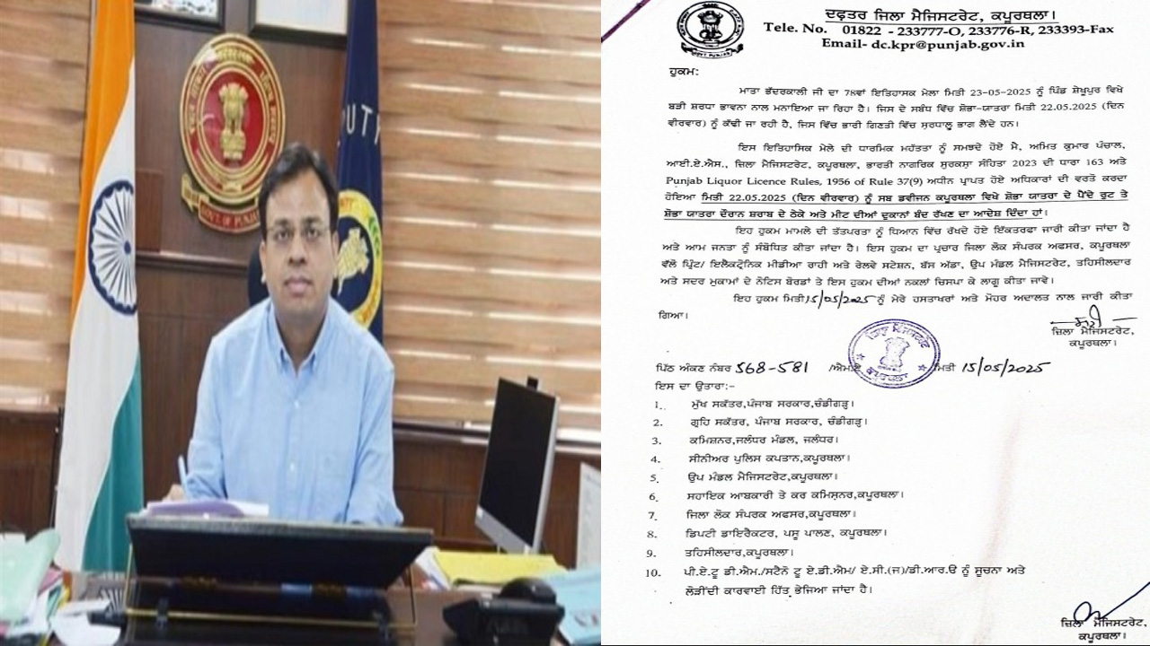 ਡਿਪਟੀ ਕਮਿਸ਼ਨਰ ਕਮ ਜਿਲ੍ਹਾ ਮੈਜਿਸਟ੍ਰੇਟ ਸ਼੍ਰੀ ਅਮਿਤ ਕੁਮਾਰ ਪੰਚਾਲ ਵਲੋਂ ਮਾਤਾ ਭੱਦਰਕਾਲੀ ਜੀ ਦੇ 78 ਵੇਂ ਇਤਿਹਾਸਕ ਮੇਲੇ ਸਬੰਧੀ 22 ਮਈ ਨੂੰ ਸਜਾਈ ਜਾਣ ਵਾਲੀ ਸ਼ੋਭਾ ਯਾਤਰਾ ਦੇ ਮੱਦੇਨਜ਼ਰ ਸ਼ਰਾਬ ਦੇ ਠੇਕੇ ਤੇ ਮੀਟ ਦੀਆਂ ਦੁਕਾਨਾਂ ਬੰਦ ਰੱਖਣ ਦੇ ਹੁਕਮ ਦਿੱਤੇ ਹਨ। ਭਾਰਤੀ ਨਾਗਰਿਕ ਸੁਰਕਸ਼ਾ ਸੰਹਿਤਾ 2023 ਦੀ ਧਾਰਾ 163 ਤੇ ਪੰਜਾਬ ਲੀਕਰ ਲਾਇਸੈਂਸ ਰੂਲਜ 1956 ਦੀ ਧਾਰਾ 37 (9) ਤਹਿਤ ਪ੍ਰਾਪਤ ਅਧਿਕਾਰਾਂ ਦੀ ਵਰਤੋਂ ਕਰਦੇ ਹੋਏ ਸ੍ਰੀ ਪੰਚਾਲ ਨੇ ਕਿਹਾ ਕਿ ਮੇਲੇ ਦੀ ਧਾਰਮਿਕ ਮਹੱਤਤਾ ਦੇ ਮੱਦੇਨਜ਼ਰ 22 ਮਈ ਨੂੰ ਸਬ ਡਵੀਜ਼ਨ ਕਪੂਰਥਲਾ ਵਿਖੇ ਸ਼ੋਭਾ ਯਾਤਰਾ ਦੇ ਪੈਂਦੇ ਰੂਟ ’ਤੇ ਸ਼ੋਭਾ ਯਾਤਰਾ ਦੌਰਾਨ ਸ਼ਰਾਬਟ ਦੇ ਠੇਕੇ ਤੇ ਮੀਟ ਦੀਆਂ ਦੁਕਾਨਾਂ ਬੰਦ ਰੱਖੀਆਂ ਜਾਣਗੀਆਂ।