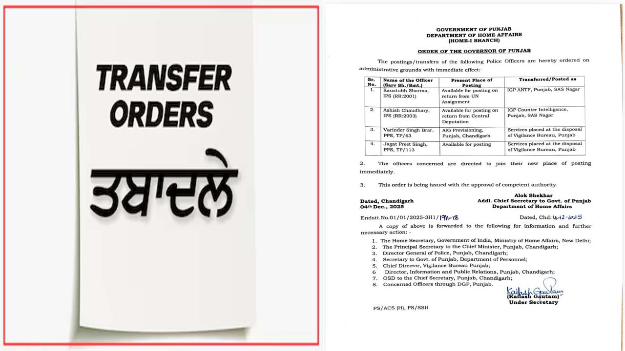 ਪੰਜਾਬ ਸਰਕਾਰ ਨੇ ਦੋ ਆਈਪੀਐਸ ਅਤੇ ਦੋ ਪੀਪੀਐਸ ਅਧਿਕਾਰੀਆਂ ਨੂੰ ਅਹਿਮ ਅਹੁਦਿਆਂ ਉਤੇ ਤਬਦੀਲ ਕਰ ਦਿੱਤਾ ਹੈ।ਕੌਸਤੁਭ ਸ਼ਰਮਾ ਨੂੰ ਐਂਟੀ-ਨਾਰਕੋਟਿਕਸ ਸਟੋਰਜ਼ ਫੋਰਸ ਦੀ ਮਹੱਤਵਪੂਰਨ ਜ਼ਿੰਮੇਵਾਰੀ ਸੌਂਪੀ ਗਈ ਹੈ।