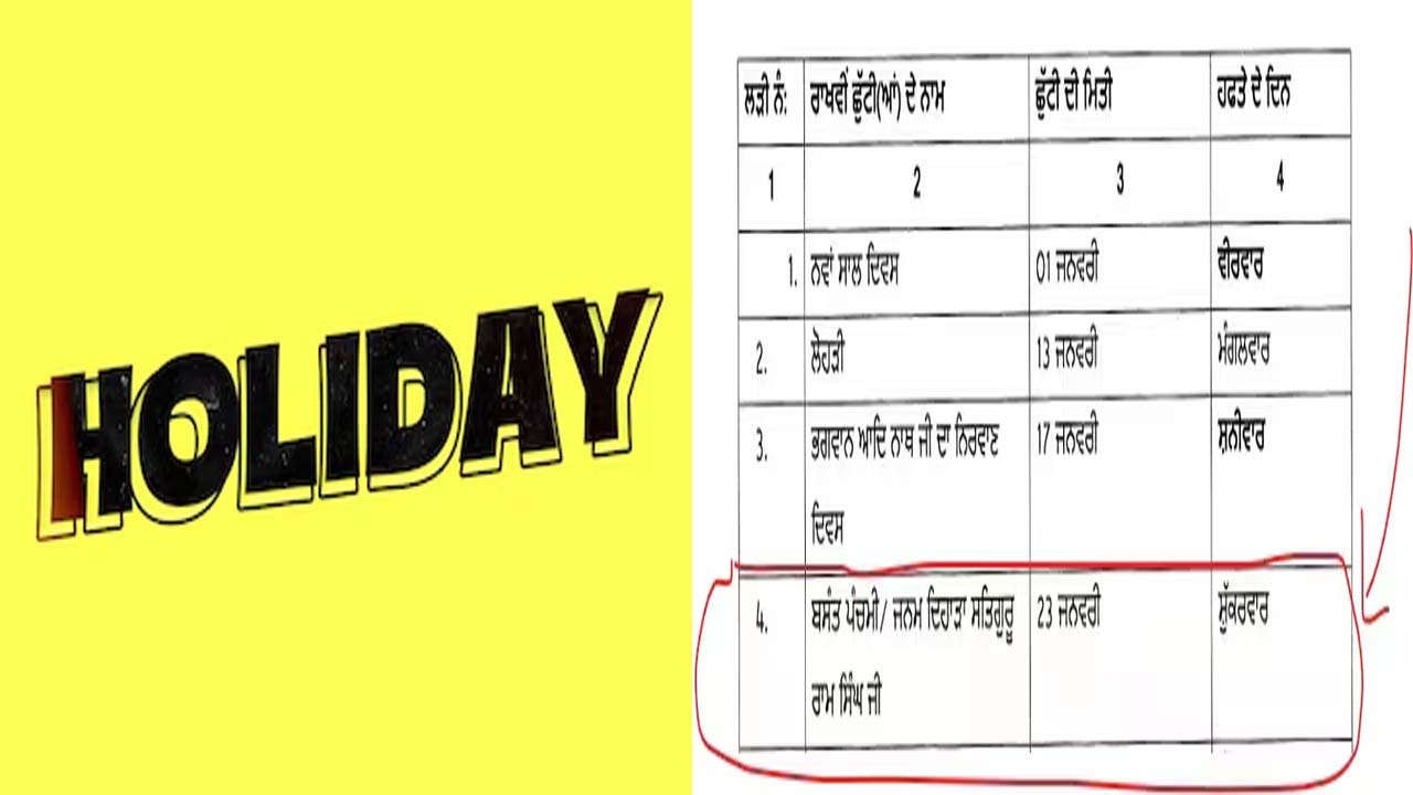 ਸਾਲ 2026 ਦਾ ਪਹਿਲਾ ਮਹੀਨਾ ਛੁੱਟੀਆਂ ਨਾਲ ਭਰਿਆ ਹੋਇਆ ਹੈ। ਇਸ ਮਹੀਨੇ ਸਕੂਲਾਂ ਵਿਚ ਪਹਿਲਾਂ ਹੀ 14 ਜਨਵਰੀ ਤੱਕ ਛੁੱਟੀਆਂ ਸਨ। ਲੋਹੜੀ ਤੇ ਗਣਤੰਤਰ ਦਿਵਸ ਤੋਂ ਅਲਾਵਾ ਪੰਜਾਬ ਵਿਚ ਇਕ ਹੋਰ ਸਰਕਾਰੀ ਛੁੱਟੀ ਆਉਣ ਲਈ ਤਿਆਰ ਹੈ। ਪੰਜਾਬ ਸਰਕਾਰ ਦੇ ਸਾਲ 2026 ਦੇ ਛੁੱਟੀਆਂ ਦੇ ਅਧਿਕਾਰਤ ਕਲੰਡਰ ਮੁਤਾਬਕ ਬਸੰਤ ਪੰਚਮੀ ਅਤੇ ਜਨਮ ਦਿਹਾੜਾ ਸਤਿਗੁਰੂ ਰਾਮ ਸਿੰਘ ਜੀ ਮੌਕੇ ਪੰਜਾਬ ਵਿਚ ਰਾਖਵੀਂ ਛੁੱਟੀ ਰਹਿਣ ਵਾਲੀ ਹੈ। ਇਸ ਦੇ ਨਾਲ ਹੀ ਇਸ ਹਫਤੇ ਲੰਬਾ ਵੀਕਐਂਡ (weekend) ਵੀ ਆ ਰਿਹਾ ਹੈ। 23 ਤਰੀਕ ਨੂੰ ਸ਼ੁੱਕਰਵਾਰ ਹੈ। ਅੱਗੇ ਸ਼ਨੀਵਾਰ ਐਤਵਾਰ ਨੂੰ ਤਕਰੀਬਨ ਮੁਲਾਜ਼ਮਾਂ ਨੂੰ ਛੁੱਟੀ ਰਹਿੰਦੀ ਹੀ ਹੈ। ਉਸ ਤੋਂ ਬਾਅਦ 26 ਜਨਵਰੀ ਨੂੰ ਵੀ ਪੂਰੇ ਦੇਸ਼ ਵਿਚ ਗਣਤੰਤਰ ਦਿਵਸ ਦੀ ਛੁੱਟੀ ਹੈ। ਕਿਉਂਕਿ ਇਸ ਮਹੀਨੇ ਇਕੱਠੇ ਚਾਰ ਦਿਨ ਛੁੱਟੀਆਂ ਹਨ। ਅਜਿਹੀ ਸਥਿਤੀ ਵਿੱਚ, ਜੋ ਲੋਕ ਕਿਤੇ ਜਾਣ ਬਾਰੇ ਸੋਚ ਰਹੇ ਹਨ, ਉਹ ਆਸਾਨੀ ਨਾਲ ਯੋਜਨਾ ਬਣਾ ਸਕਦੇ ਹਨ। ਪੰਜਾਬ ਸਰਕਾਰ ਦੇ ਕਲੰਡਰ ਮੁਤਾਬਕ 23 ਜਨਵਰੀ (ਰਾਖਵੀਂ) ਅਤੇ 26 ਜਨਵਰੀ ਨੂੰ ਸਰਕਾਰੀ ਛੁੱਟੀ ਰਹੇਗੀ। ਸ਼ੁੱਕਰਵਾਰ, ਸ਼ਨੀਵਾਰ ਅਤੇ ਫਿਰ ਐਤਵਾਰ ਹੋਣ ਕਾਰਨ ਸਕੂਲ, ਕਾਲਜ ਅਤੇ ਸਰਕਾਰੀ ਦਫਤਰ ਬੰਦ ਰਹਿਣਗੇ।